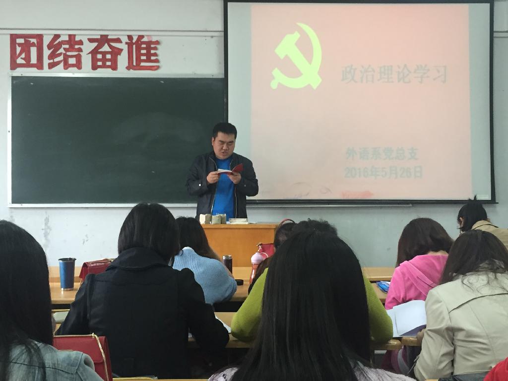 会上,党总支副书记张宪强调了政治理论学习的重要性,要求全体党员以“两学一做”学习教育为契机,加强政治理论学习,提高自身的政治素养。党总支秘书张亮宣读了延大西公司党〔2016〕5号文件《关于2016年全院政治理论学习安排的通知》和《外语系党总支2016年政治理论学习计划》。