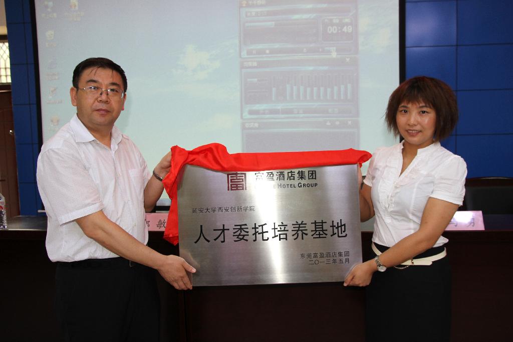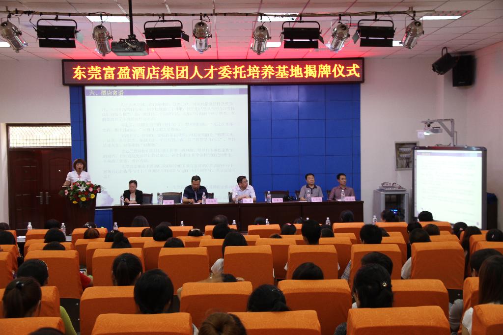 马勇经理在仪式上致辞,他对东莞富盈酒店集团一行的到来表示了热烈的欢迎,并从实习实践对员工培养及合作单位两方面具有的意义肯定了校企合作的重要性和必要性,对员工的实习提出了殷切的希望并对双方的合作给予了美好的祝愿。李春燕总监向到会的老师及同学们介绍了集团的基本概况,特别展示了公司旅游管理与服务教育1001班员工本学期在该集团实习的工作、培训、技能大赛、生活等基本情况,以自己的切身经历鼓励在校的旅游专业员工积极参与实习实践及社会活动,既要对未来的职业生涯充满希望,又要为今后的成功提前做好基础准备。随后,马勇经理与李春燕总监共同为人才委托培养基地揭牌。