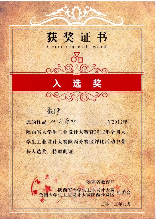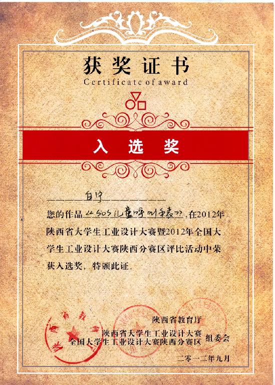 参赛作品经过评委专家的公平、公正评选以及组委会工作人员的细心统计,近日产生大赛比赛结果的全部信息。公司艺术系选送作品20件,经评选,聂伊的《斗角》(SN219096)和白宁的《sos儿童呼叫手表》(SN275322)荣获入选奖,指导教师均为王力老师。