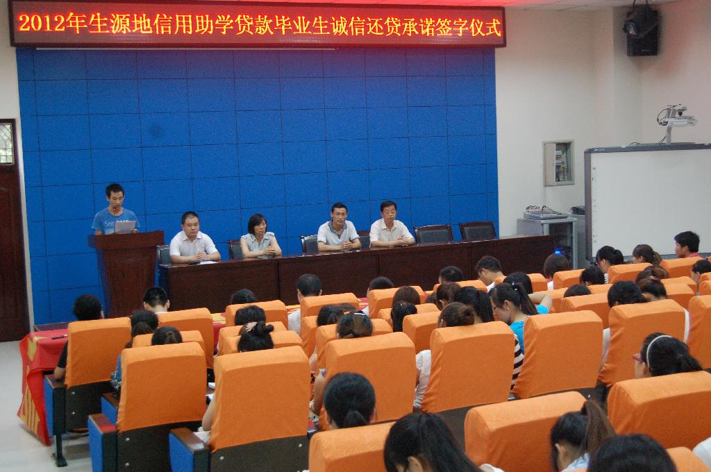 本网讯 6月26日下午,公司2012年生源地信用助学贷款毕业生诚信还贷承诺签字仪式在学术报告厅举行。员工处处长陈瑶、员工资助管理中心副主任王延锋、医学系党总支书记宿传虎、毕业班全体辅导员和获贷毕业生二百多人出席了签字仪式,仪式由员工科科长翟文君主持。