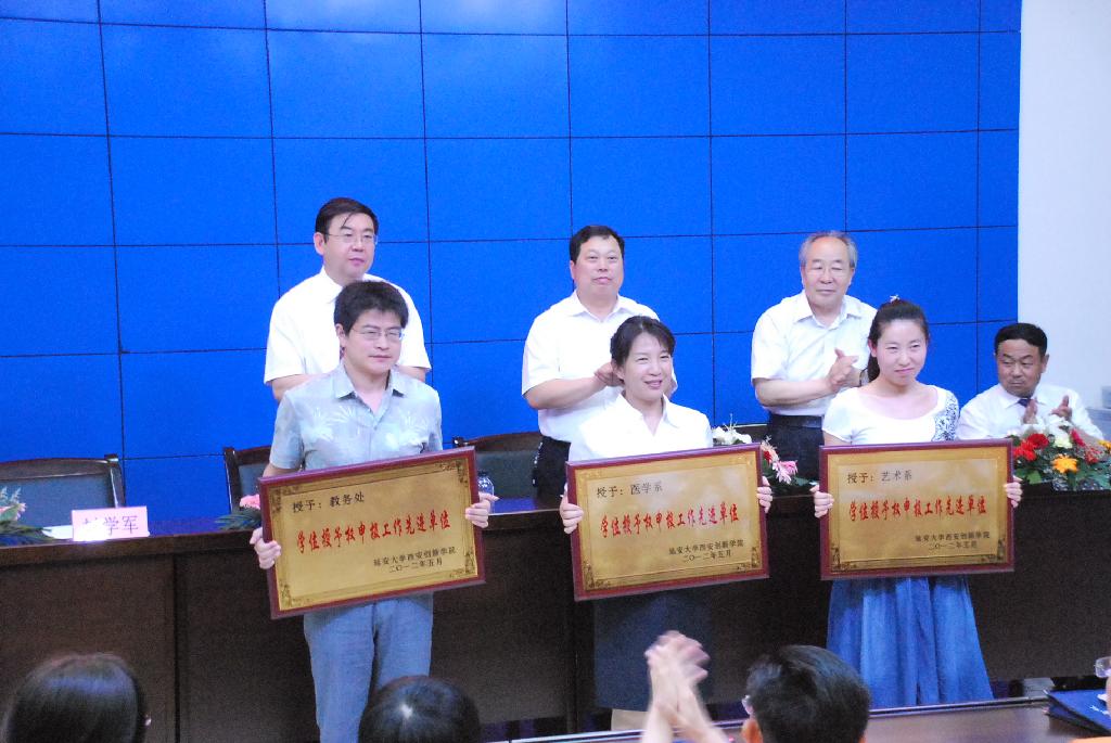 大会首先进行了公司学士学位授予权申请工作表彰。经理助理、教务处处长马保国宣读了公司表彰决定,公司领导为教务处、艺术系、医学系三个先进单位、张粉莲等15位优秀工作者和中文系、经管系、外语系、理工系、建工系等优秀组织单位颁奖。