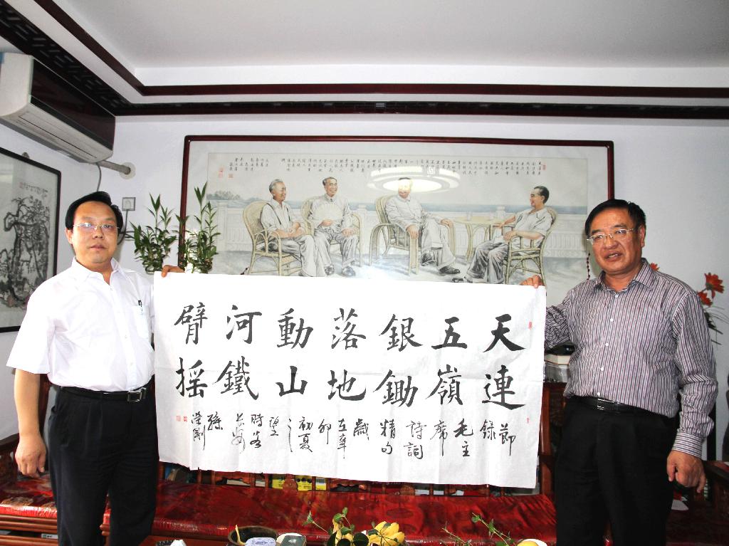 刘书记十分关注公司“七一”前夕在西安碑林博物馆主办的《庆祝建党90周年王必成个人红色收藏大型展览》情况,参观过程中,他饶有兴趣地询问了王必成老师红色收藏的缘起、体会、所遇到的困难和今后的想法,并和王老师就红色收藏进行了亲切交流。刘书记对王老师在红色收藏领域所取得的成就表示祝贺。他说,王老师的红色收藏内容丰富,特色鲜明,很珍贵,观后很震撼。他表示希望能将王老师的红色收藏与延安精神教育和革命传统教育相结合,积极寻找展示机会,用红色文物向社会公众,尤其是青年员工进行革命传统主义教育、爱党爱国主义教育,积极发挥红色文物的社会教育功能,为弘扬红色文化做出更大的贡献。刘书记在仔细鉴赏了珍贵的文物后,一一翻阅全国观众的评论留言,并即兴为王老师亲笔题词:“有志者事必成,尽藏无价宝;红色之文化,激励后来人;赏来实震撼,祝愿攀高峰。”王老师表示,他身为延大人,甘愿做红色文化的传承者,愿意将自己的藏品在更广阔的舞台上向社会公众展示。