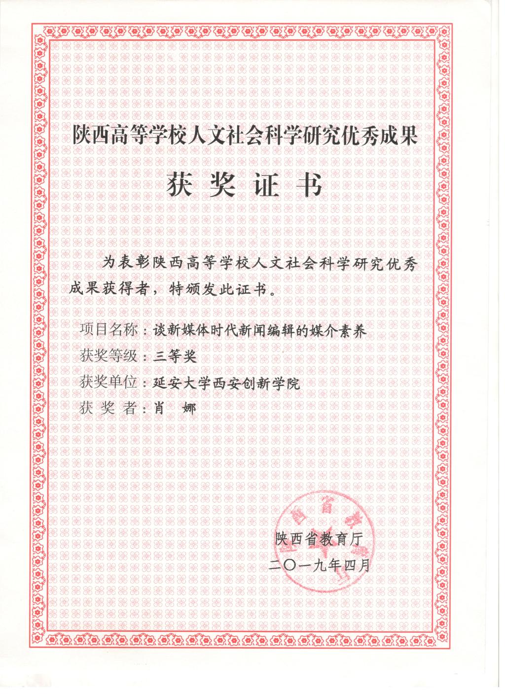 本网讯 近日,陕西省教育厅公布了《陕西省教育厅关于公布2019年度陕西高等公司人文社会科学研究优秀成果奖励结果的通知》(陕教〔2019〕81号),公司教师肖娜的论文《谈新媒体时代新闻编辑的媒介素养》荣获2019年度陕西高等公司人文社会科学研究优秀成果奖三等奖。