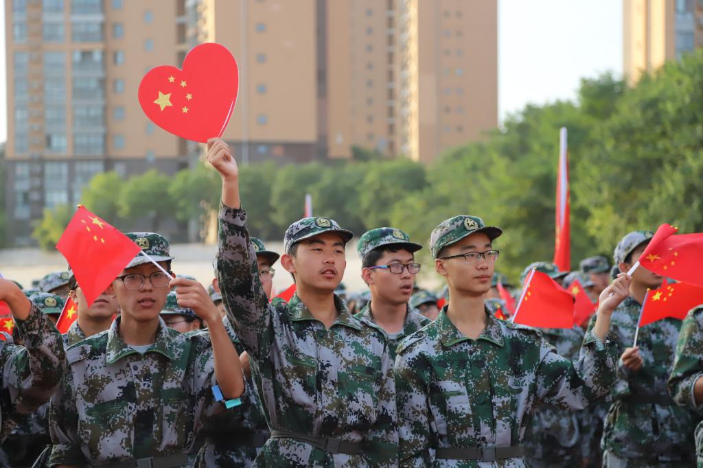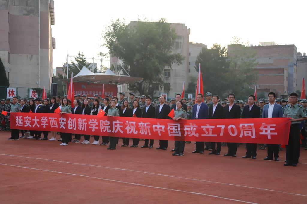 7时整,五星红旗迎着朝阳冉冉升起,军训团行军礼,全体师生高唱国歌。文公司员工代表左斌同学以《爱国情深,报国志坚》为题,为全体师生做演讲,他通过讲述新中国成立70年来祖国发生的伟大巨变,激励和教育当代青年要勇于担当历史使命,把个人理想融入到国家的事业中,志存高远,脚踏实地,努力践行爱国奋斗精神,立足本职,为中华民族伟大复兴作贡献。随后,文公司2018级50名同学集体朗诵《少年中国说》,他们手持红黄两色花球,摆出五星红旗和70的字样,铿锵有力的诵读声展现了新时代创新学子的良好精神风貌,激情澎湃的旋律点燃了在场师生的爱国热情。全体师生及军训团教官手挥小国旗和气球,高唱《歌唱祖国》,为新中国成立70周年献礼。