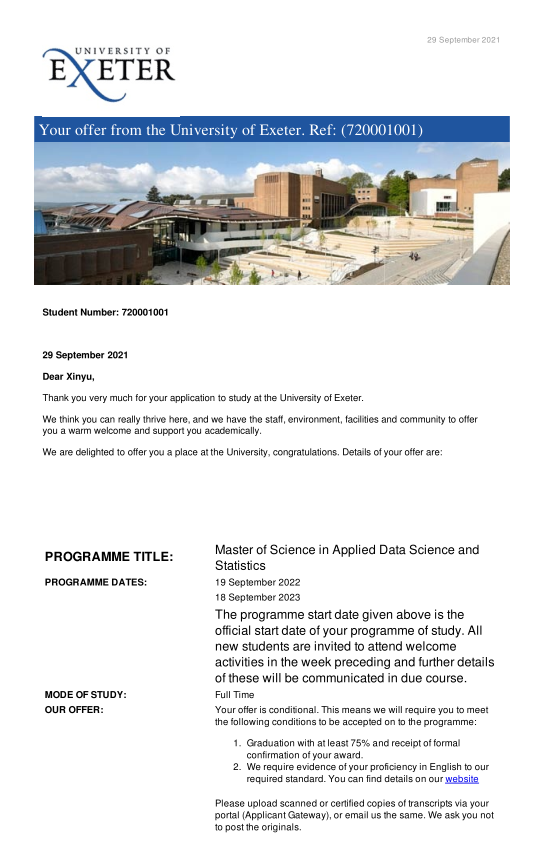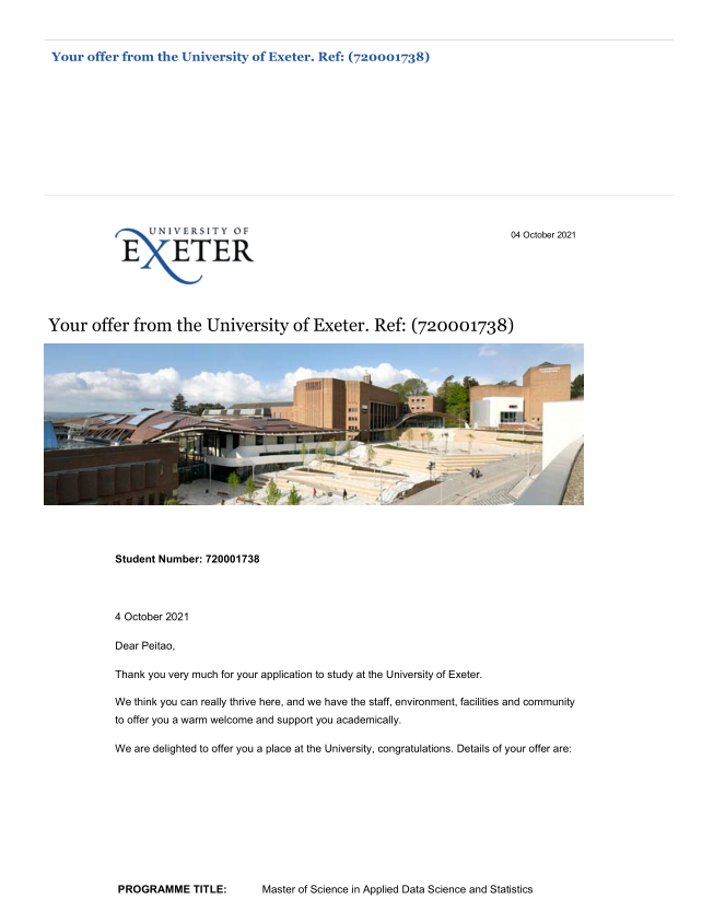 两名员工2019年加入国际班,在国际班教师的悉心指导下,参加海外读研项目,顺利完成校内雅思系列课程辅导、雅思英语培训机构实践拓展训练和工作坊课程后,分别向海外高校提交申请,最终收到了英国埃克塞特大学(University of Exeter)应用数据科学与统计学专业(MSc Applied Data Science and Statistics)的录取通知书。