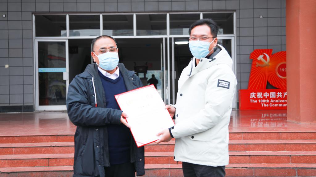 集团疫情防控办主任武宝宁代表公司接受捐赠,并对丁贵亮员工的母校情怀和刘超先生的大爱表示衷心感谢。他表示丁贵亮员工长期以来关心公司的发展,刘超先生默默奉献爱心,用实际行动助力“疫”线,公司一定会妥善使用这批物资,开展疫情防控工作。随后武宝宁为丁贵亮员工颁发捐赠证书。