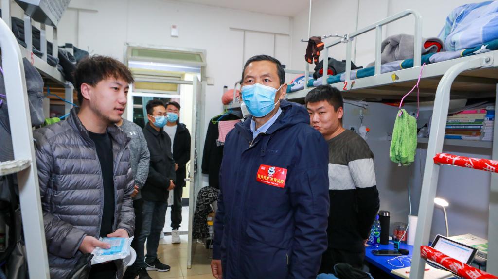 在员工宿舍,崔海潮详细询问了同学们制动防疫期间的所需所盼,细致回答了同学们在学习生活上集中关切的问题,勉励大家坚定信心,同心抗疫,惜时勤学,积极进步。指出要充分调度工作人员并发挥员工志愿者的作用,切实为广大同学、特别是正在接受隔离同学做好生活保障。在和同学们谈心时,陈瑶叮嘱同学们自觉遵守疫情防控工作要求,积极支持和配合工作人员工作,坚持非必要不出门,戴口罩,勤洗手,常通风,在楼内不串门,不聚集,维护好宿舍卫生,保持良好生活环境,在做好自我防护的同时,做好学习计划,坚持线上学习,在现有的条件下,坚持锻炼身体,培育个人爱好,在这个特殊的时期过的充实而丰富多彩。