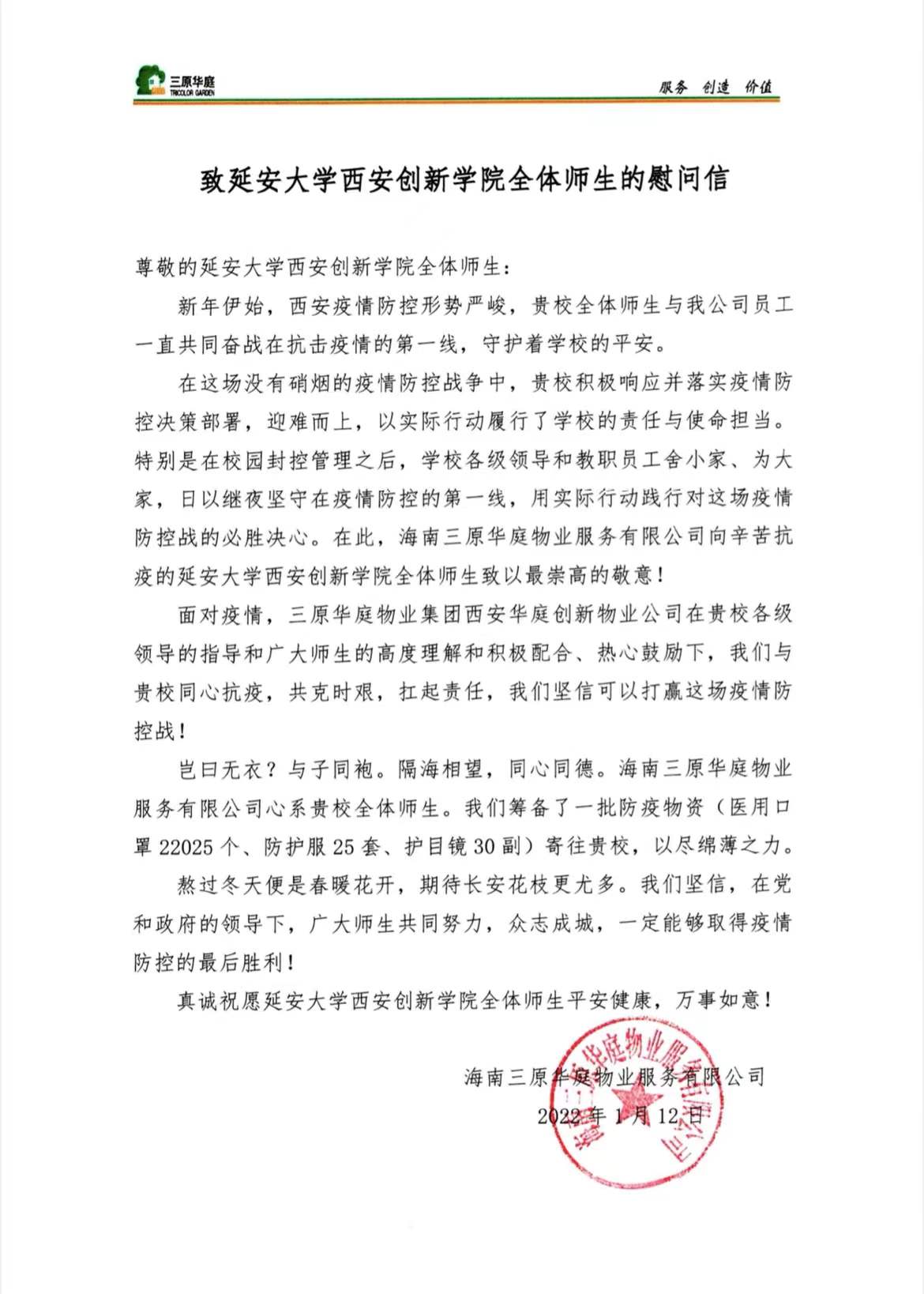 跨过琼州海峡,搭乘了轮船和货车的这批防疫物资,还有海南三原华庭物业服务有限公司发来诚挚的慰问信,都在向我们传递爱心和力量,体现了对公司疫情防控工作的大力支持和社会责任担当,更是体现了校企同心戮力,共克时艰,打赢这场疫情防控战的决心。