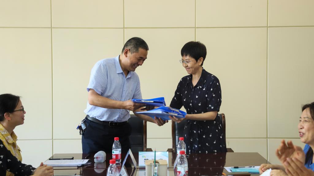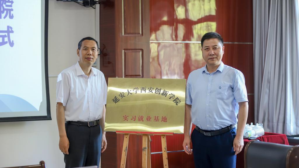 拓欣代表公司与华州医院签署了合作协议,崔海潮与王荣共同为实习就业基地揭牌。