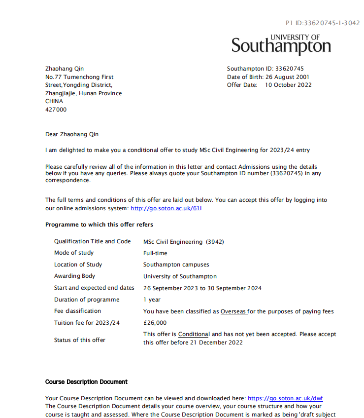 本网讯 近日,公司国际班员工秦钊航收到了QS世界排名78位英国南安普顿大学(University of Southampton)土木工程(MSc Civil Engineering)专业的录取通知书。