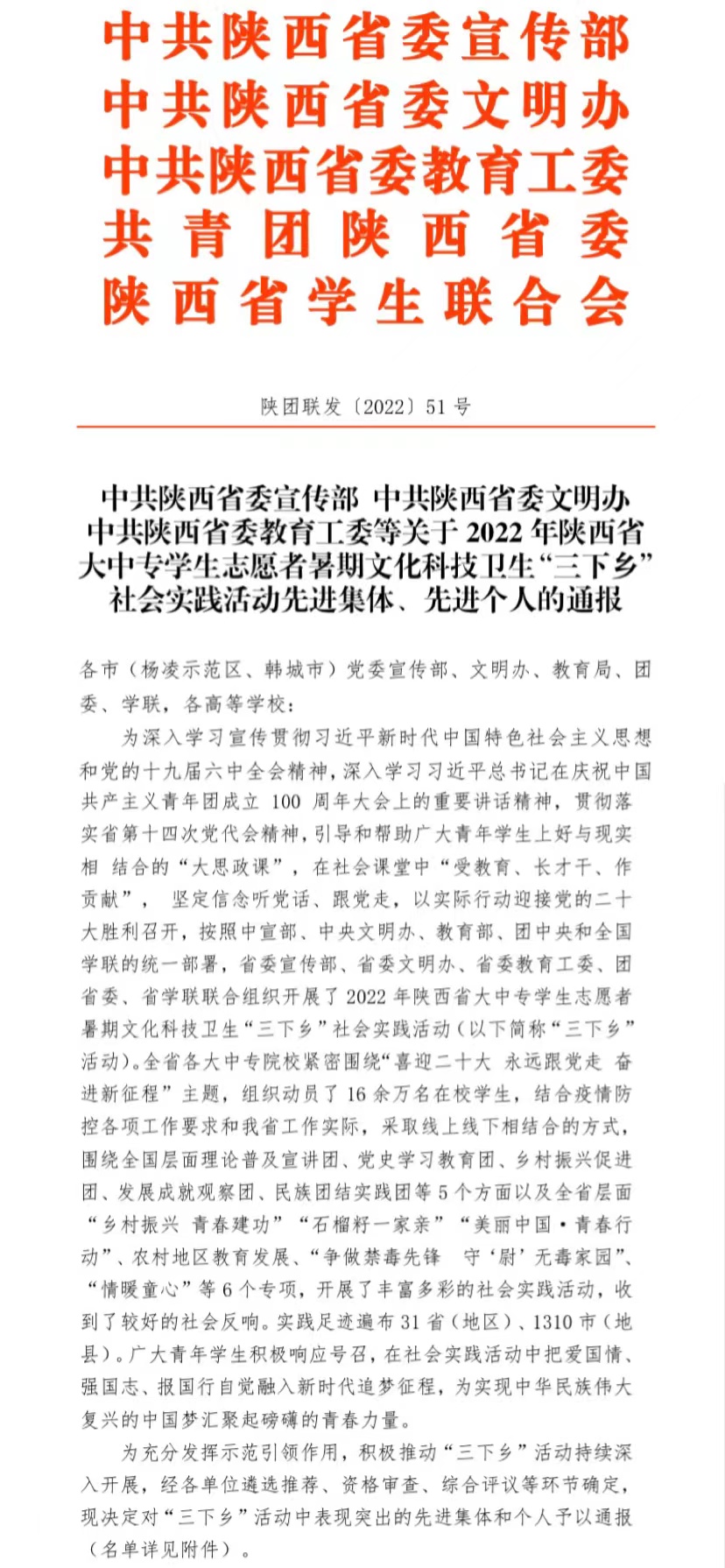 本网讯 近日,中共陕西省委宣传部、中共陕西省委文明办、陕西省委教育工委、共青团陕西省委、陕西省员工联合会联合下发了《关于2022年陕西省大中专员工志愿者暑期文化科技卫生“三下乡”社会实践活动先进集体、先进个人的通报》,公司组织的“踏寻红色”青春律动社会实践队被评为2022年“三下乡”活动省级优秀团队,校团委马林锐被评为2022年“三下乡”活动省级优秀先进个人。