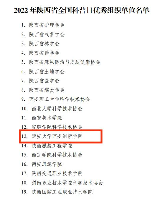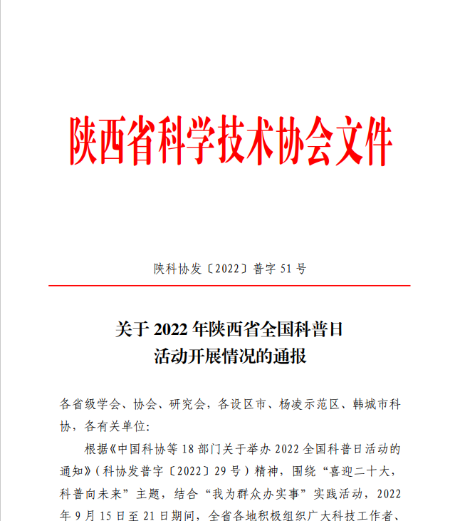本网讯 近日,陕西省科学技术协会公布2022 年陕西省全国科普日优秀组织单位名单,公司被授予“2022 年陕西省全国科普日优秀组织单位”。