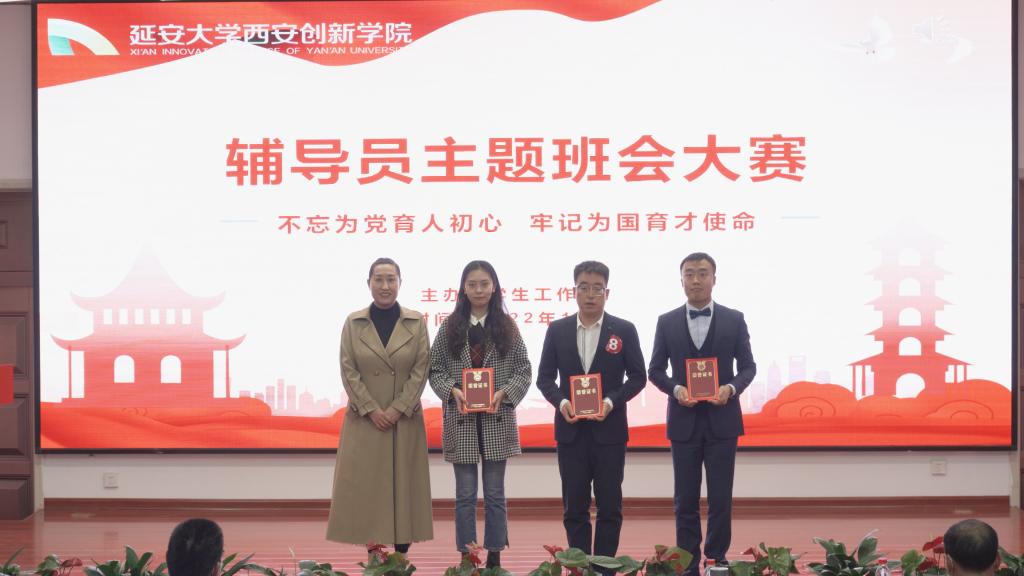 党委副书记白雪为艺术与传媒公司党总支副书记刘雷、韦德体育辅导员葛萌萌、楚玥颁发三等奖