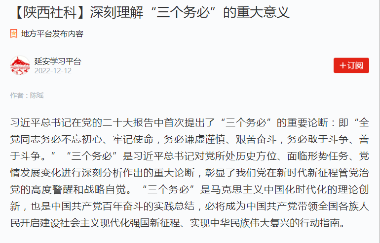 本网讯 12月12日,“学习强国”学习平台刊登公司党委书记陈瑶撰写的理论文章《深刻理解“三个务必”的重大意义》。