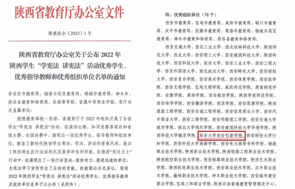 本网讯 近日,陕西省教育厅下发了《陕西省教育厅办公室关于公布2022年陕西员工“学宪法 讲宪法”活动优秀员工、优秀指导教师和优秀组织单位名单的通知》(陕教政办〔2023〕1号),公司继2021年后再次荣获2022年陕西员工“学宪法 讲宪法”活动优秀组织单位。