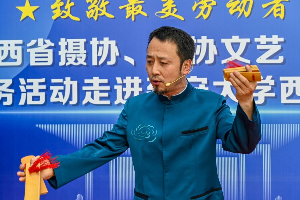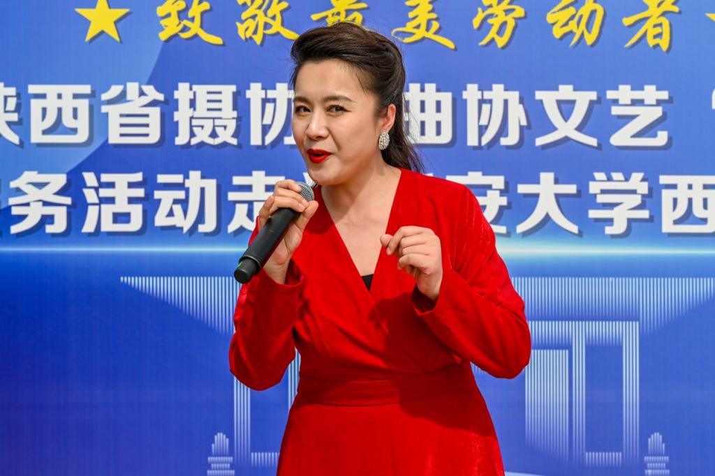 陕西广播电视台主持人郝宁、西安广播电视台主持人杨朔向工地一线劳动者致以崇高的敬意,并提前祝大家“五一”劳动节快乐。演出在中国秦腔(肖派)传人、咸阳市戏剧家协会副主席王迎春演唱的秦腔《三滴血》《王宝钏》选段中拉开序幕,中国曲艺牡丹奖获得者马凯强和马乐带来相声《欢歌笑语》,一捧一逗,现场观众捧腹乐不停;中国曲艺牡丹奖获得者杨锦龙快板《领航》,其传神的表演赢得大家阵阵掌声;陕西省民间艺术剧院有限公司魔术师郭文静带领观众沉浸到魔术奇幻世界中。本次演出在陕西省歌舞剧院歌剧演员、陕西音乐奖获得者王文娟的《走过百年》歌声中结束。文艺工作者们通过秦腔、相声、快板、魔术等节目为现场观众送上了一场精彩的文化“盛宴”。