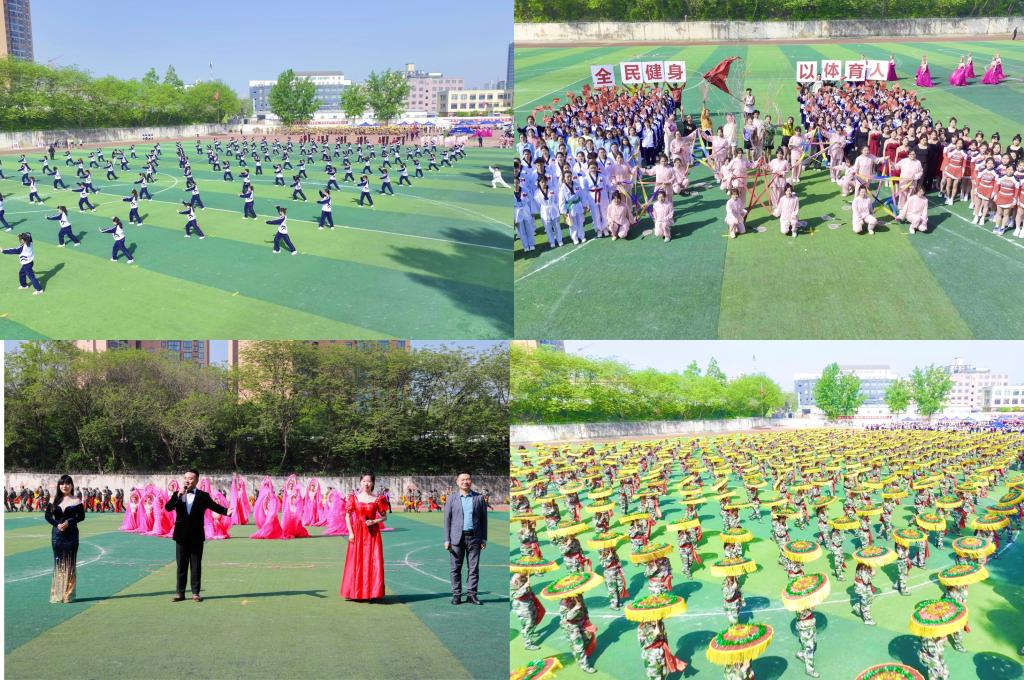 稳健有力、飘逸娴雅的太极拳拉开了本届运动会文体表演的序幕。同学们轻柔灵动、舒展大方,古老的太极拳跟随青春时代的身姿摘下神秘的面纱,展现了体育的别样力量美。空中的飞盘画出一道美丽的孤线,奔向远方;优雅的华尔兹伴随着青春的舞曲,绽放出朵朵花蕊;学子们舞动跳绳像一只只欢快、自由的小鸟;动感飞扬、意气风发的健美操展现着青春的韵律;具有民族特色的太极柔力球在学子的手上行云流水、一气呵成;一袭白衣、神采奕奕的跆拳道青年完成一次次优美潇洒的踢腿,精彩纷呈的系列表演燃动了这场体育嘉年华。“春风十万里,十万好消息”,四位老师歌唱新时代,颂扬“中国梦”,情真意切的旋律,欣欣向荣的歌词,伟大时代给平凡生活带来的无限希望和幸福感随着老师们动情的演唱传递到每一位师生的耳畔与心中。秧歌一舞,动四方!热烈奔放的情感、矫健欢乐的舞步,灵动曼妙的舞姿,节奏明快的唢呐和锣鼓声,640名创新学子用自己的“快乐跳跃”彰显着文化传承的自信!