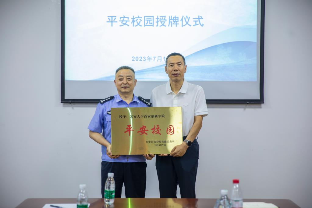 仪式最后,王军代表西安市公安局长安分局韦曲派出所向公司授予“平安校园”牌匾,崔海潮代表公司接受牌匾并合影留念。
