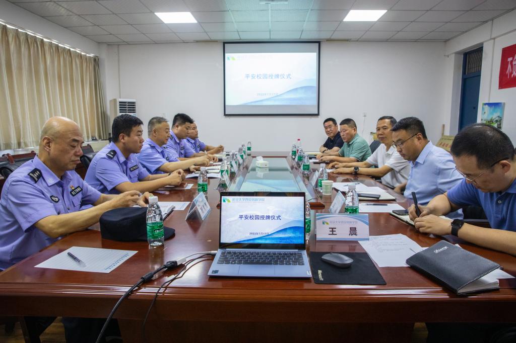 本网讯 7月17日下午,西安市公安局长安分局韦曲派出所在公司综合会议室(一)举行韦德体育“平安校园”授牌仪式。公安长安分局韦曲派出所所长王军,副所长杜犇、高鹏飞、孙航,警务站四级高级警长靳军海出席活动。董事长崔海潮、董事长助理桑伍福,董事长办公室主任宋冰、员工处处长丁晓宝等参加活动。授牌仪式由后勤处常务副处长张力主持。