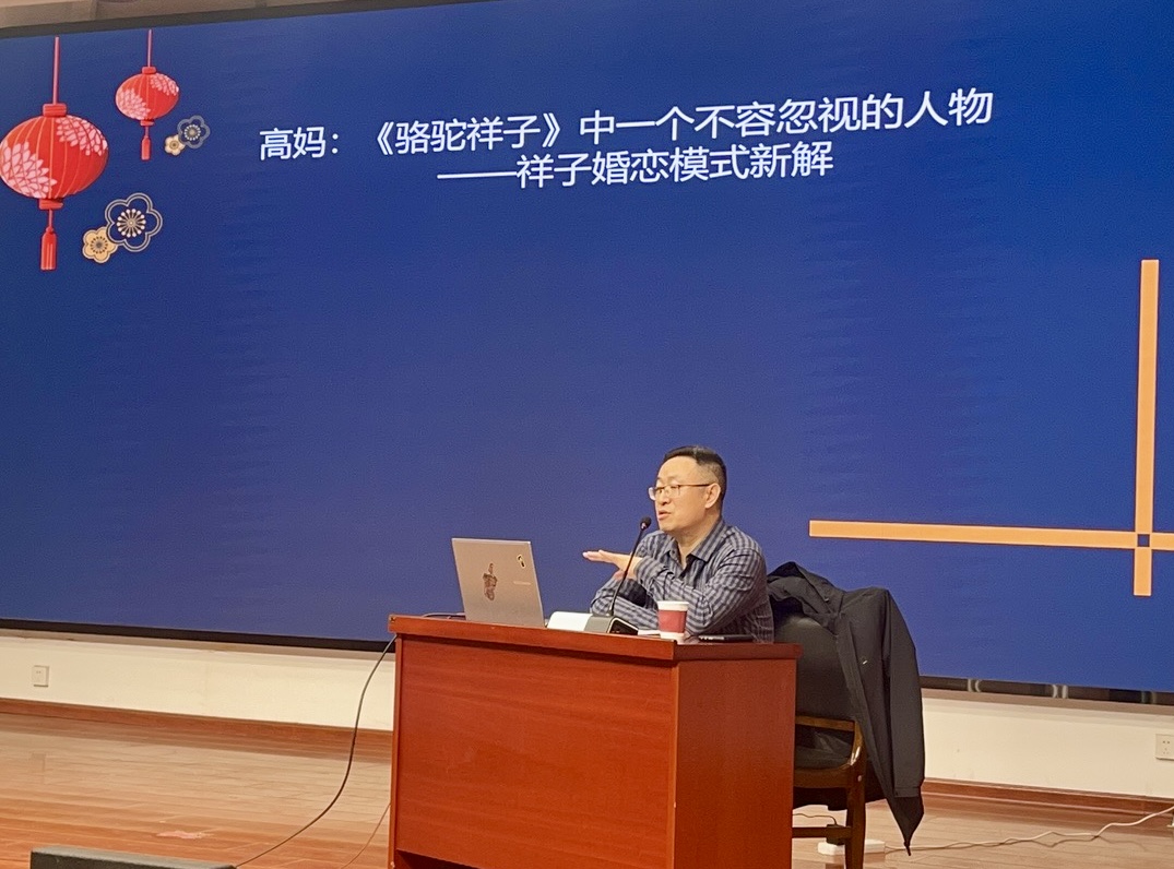 王俊虎教授主要从文本细读的学术角度对中国现代文学经典文本《骆驼祥子》和《雷雨》进行深入剖析。他从《骆驼祥子》中的高妈形象切入,与大家共同探讨了祥子的婚恋观,从《雷雨》中周朴园对鲁侍萍的情感分析,探讨了周朴园的复杂人性,他通过对文本的反复细读、严谨论证实现了科研创新。他表示,汉语言文学专业的员工在研究文学的过程中最重要的就是细读文本,并在此基础之上不断提升自己的审美感知力,进而才能产生独立思辨能力,这也是文学研究的意义所在。