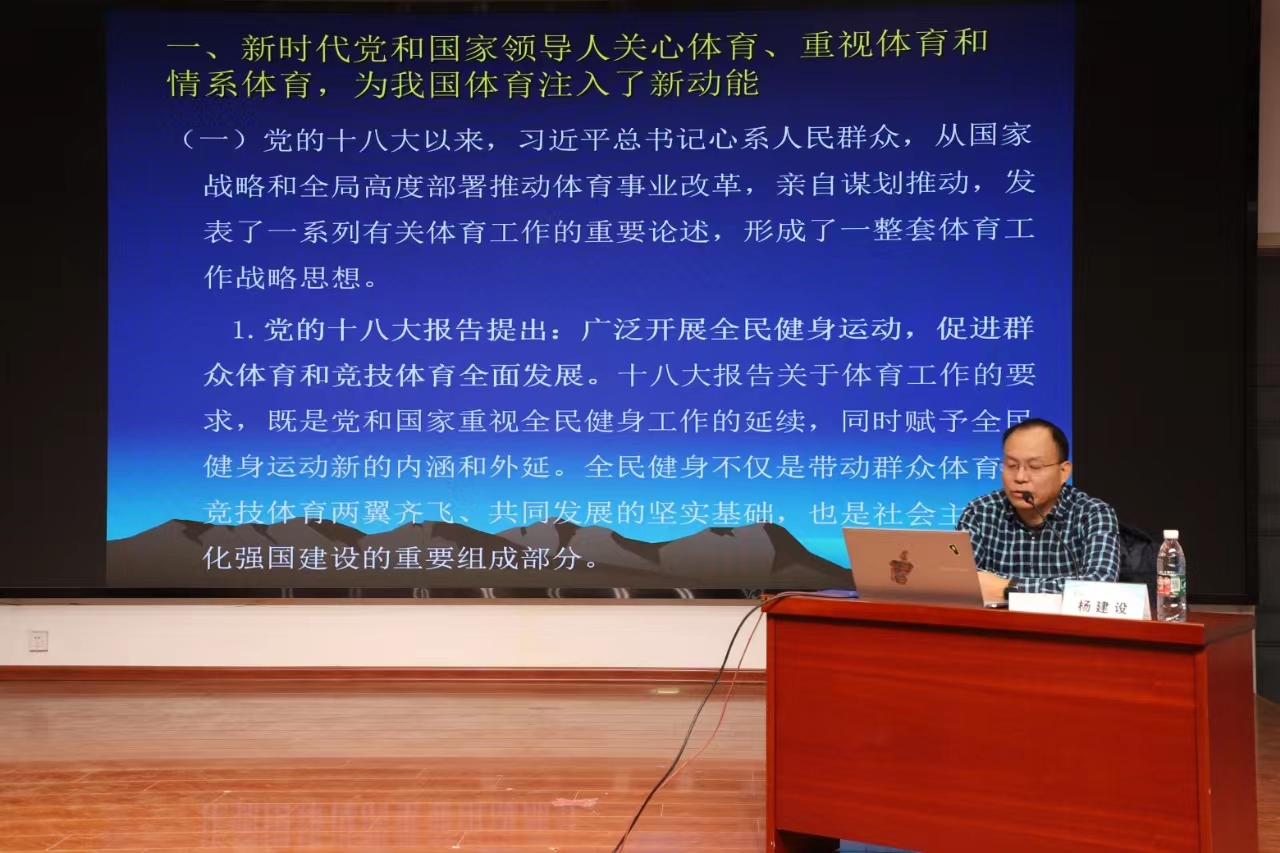 杨建设教授长期致力于我国全民健身和社会体育改革理论及实践研究,并取得重大研究成果。报告中,他着重对新时代国家颁布的促进体育发展的诸多政策及法律法规,特别是关于全民健身和公司体育改革发展政策文件进行了细致的梳理解读,既有理论的概括阐述,又有实践具体说明。会后,体育教学部全体教师与杨教授就体育科研、体育教学、运动竞赛及全民健身过程中的相关理论和实践进行了深入交流。
