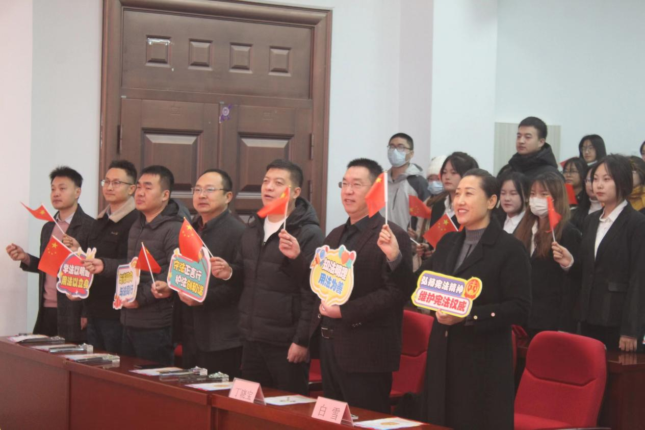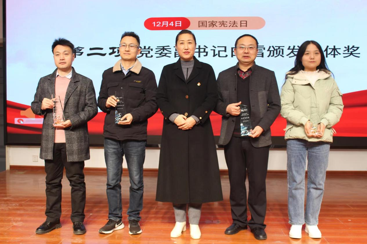 本次活动由线下表彰大会和观看教育部线上视频直播两部分组成。表彰会上,员工处副处长张亮宣读了《关于表彰2023年“学宪法 讲宪法”活动先进单位及个人的通知》。白雪、丁晓宝分别为“宪法卫士”先进组织单位及“学宪法 讲宪法”演讲比赛视频获奖员工颁奖。国旗护卫队领学宪法重点条文。现场师生手举小国旗,齐声高呼公司2023年宪法宣传教育口号“与光同向、与法同行,弘扬宪法精神、维护宪法权威”,将活动氛围推向高潮。