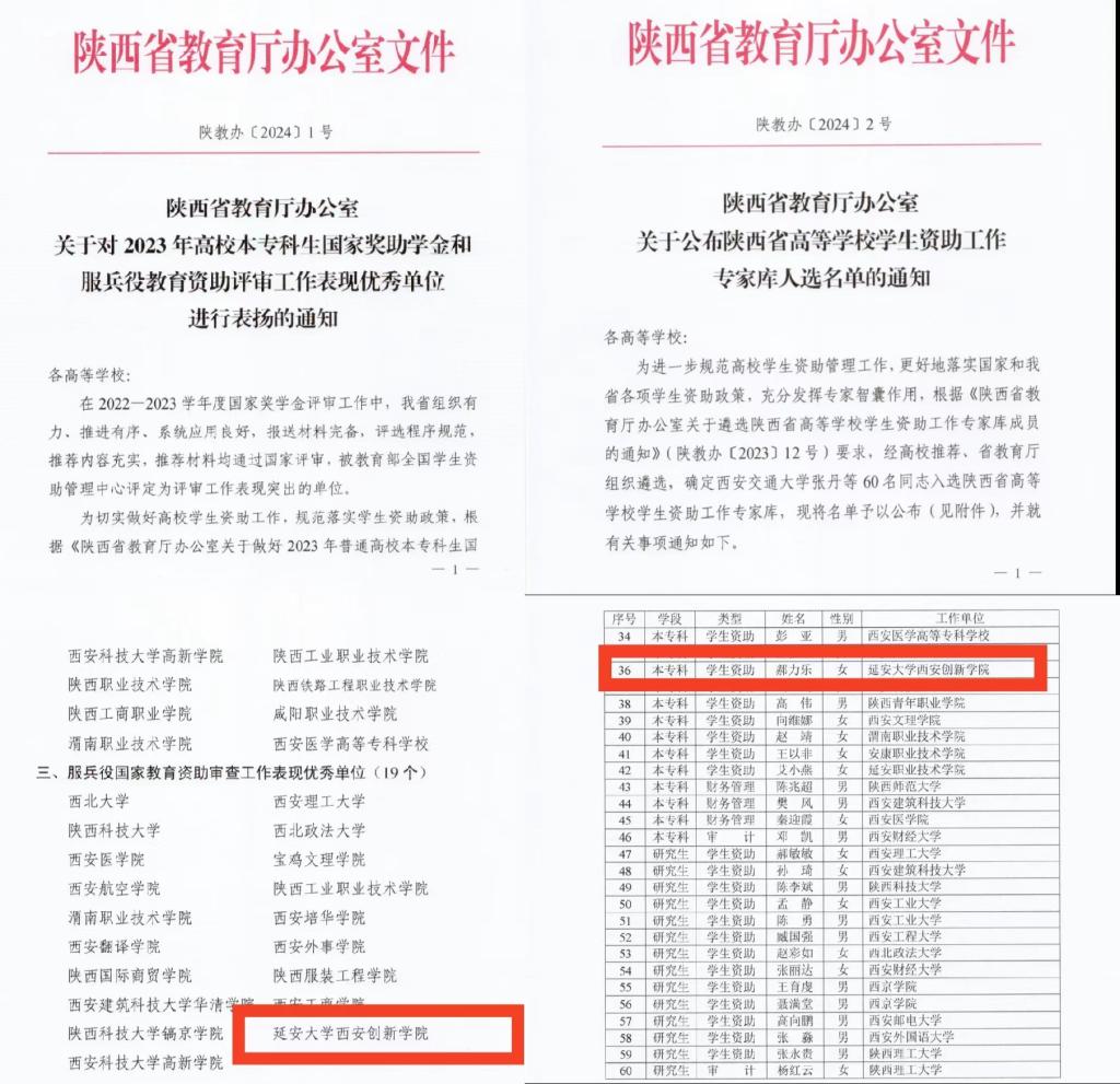 本网讯 近日,陕西省教育厅印发《关于对2023年高校本专科生国家奖助学金和服兵役教育资助评审工作表现优秀单位进行表扬的通知》《关于公布陕西省高等公司员工资助工作专家库人选名单的通知》,公司员工处资助管理中心荣获服兵役国家教育资助审查工作优秀单位,员工处资助管理中心郝力乐同志入选陕西省高等公司员工资助工作专家库并收到省教育厅员工资助事务中心的感谢信。