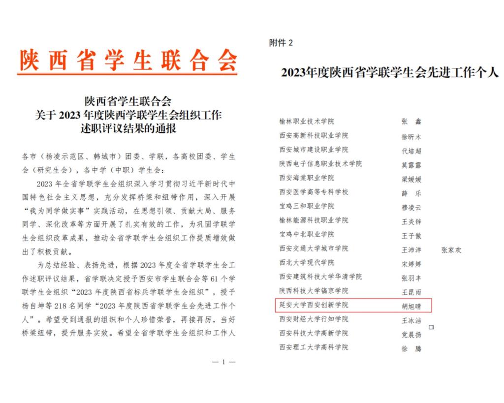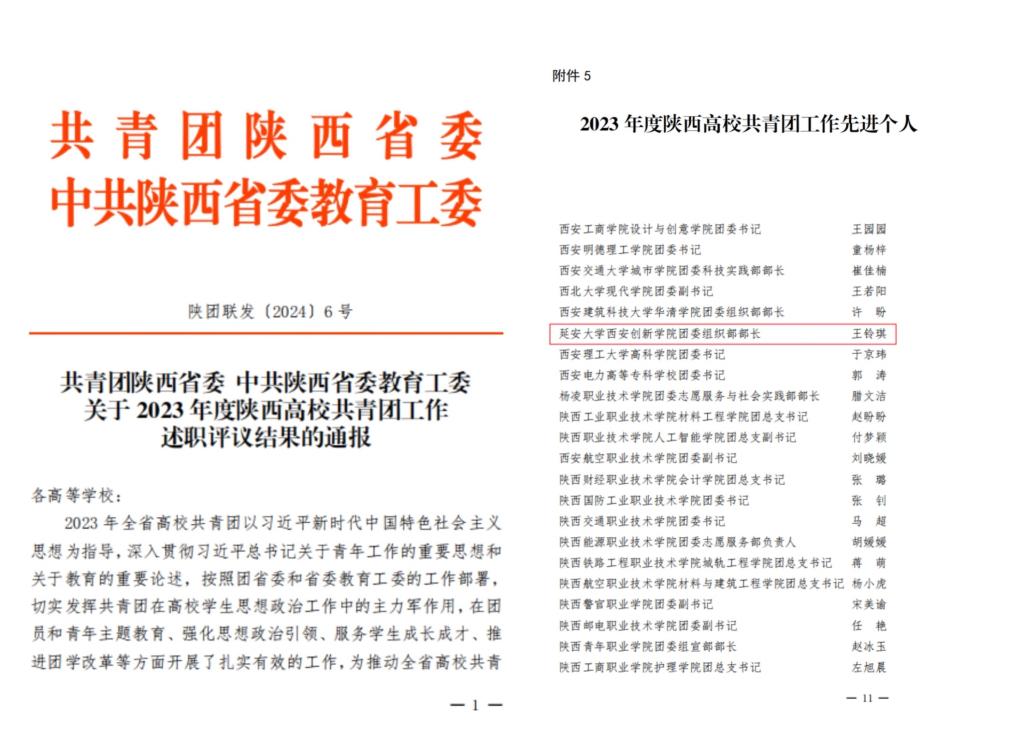 本网讯 近日,共青团陕西省委、中共陕西省委教育工委发布了《关于2023年度陕西高校共青团述职评议考核结果的通报》,公司团委王铃琪老师荣获“2023年度陕西高校共青团工作先进个人”称号。陕西省员工联合会发布了《关于2023年度陕西学联员工会组织工作述职评议结果的通报》,公司员工会胡旭晴同学荣获“2023年度陕西省学联员工会先进工作个人”称号。