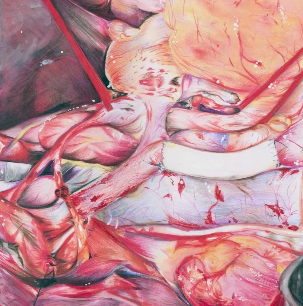 作品简介:本作品为一胰腺肿瘤患者经“肠系膜上静脉人工血管置换术”术中图像,图中可见置换后的肠系膜上静脉吻合良好,胃十二指肠动脉断离后肝固有动脉缝扎良好,肠系膜上动脉、肝门静脉、下腔静脉、腹主动脉以及局部薄膜和神经组织等解剖结构准确,位置清晰,色彩鲜明。可供医员工进行腹部外科局部解剖学习。