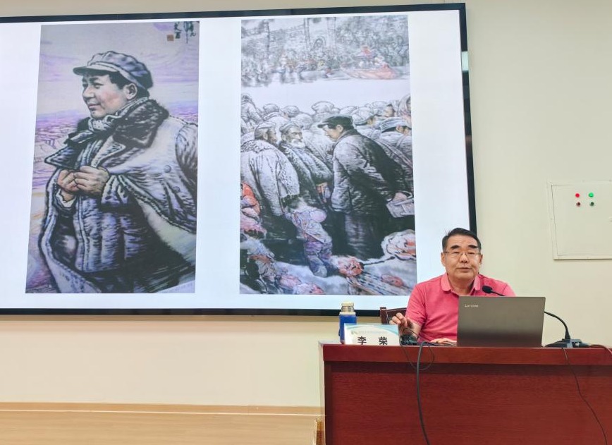 李荣教授剖析了中国画笔墨酣畅、气韵生动、人与自然和谐共生的艺术特点,讲授了欣赏和评价中国画的视角和方式,阐释了“写生”是绘画创作过程中极其重要的环节。通过展示刘文西、崔振宽、李荣等三位先生的绘画作品,分析了他们的绘画特点和风格以及长安画派、黄土画派的联系与区别。他指出,绘画是画家心灵开放的花朵,写生则是画家主观心灵的审美表达。