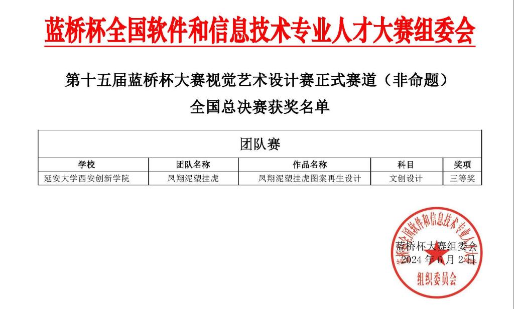其中,由王玉红老师指导、陈楠楠同学的《凤翔泥塑挂虎图案再生设计》荣获省级一等奖,全国三等奖;张艾涛等6人(队)荣获省级二等奖;廖晨阳等13人(队)获省级三等奖;谢奇等10人(队)获优秀奖。本次获奖数量创下艺术公司单项竞赛获奖数量历史新高,不仅充分肯定了艺术公司员工的专业能力,也是对教师教学和竞赛指导工作的认可。