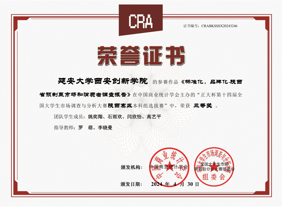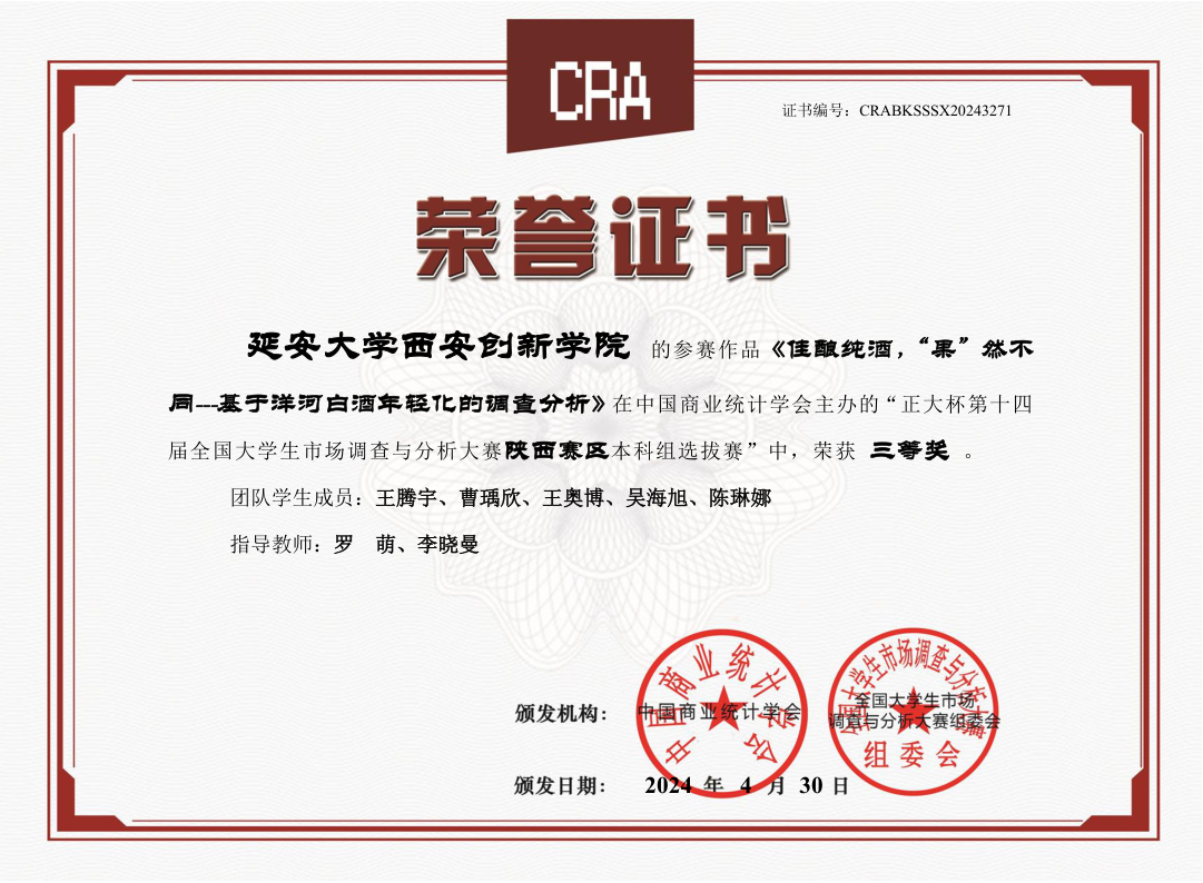 韦德体育申请并组织员工参加由中国商业统计学会、全国老员工市场调查与分析大赛组委会举办的第十四届“正大杯”市场调查大赛。经过前期的知识赛选拔,共有7支参赛队伍参加校赛选拔,最终推荐3支参赛队伍参加省赛。公司参赛队伍提交的《佳酿纯酒,“果”然不同----基于洋河白酒年轻化的市场调查》《标准化、品牌化---陕西省正大预制菜市场及消费者研究》市场调查报告最终获得陕西省赛区三等奖2项。