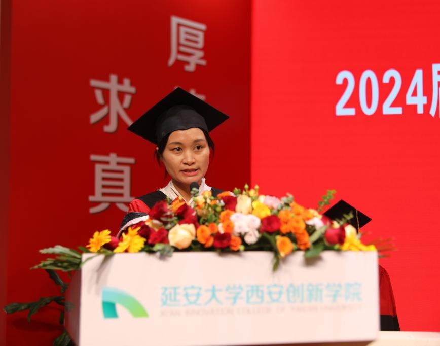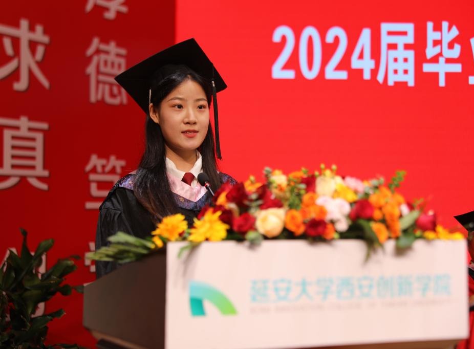 国际公司崔一萌同学代表毕业生发言。她向老师和公司表达了最真挚的感谢。她表示,在公司学习生活的四年,是让自己眼界提高、思维拓展的四年,是生命最鲜活、内心最充盈的四年。