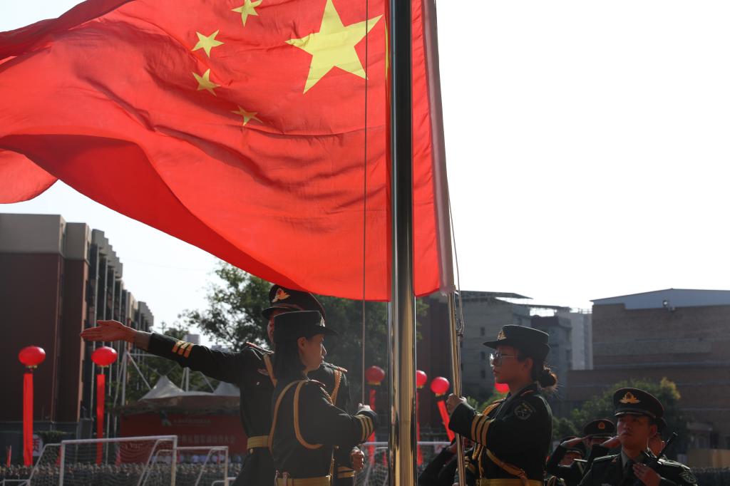 迎朝阳,升国旗,奏国歌,五星红旗冉冉升起,在熠熠光辉下迎风招展,2024级开学典礼正式开始。