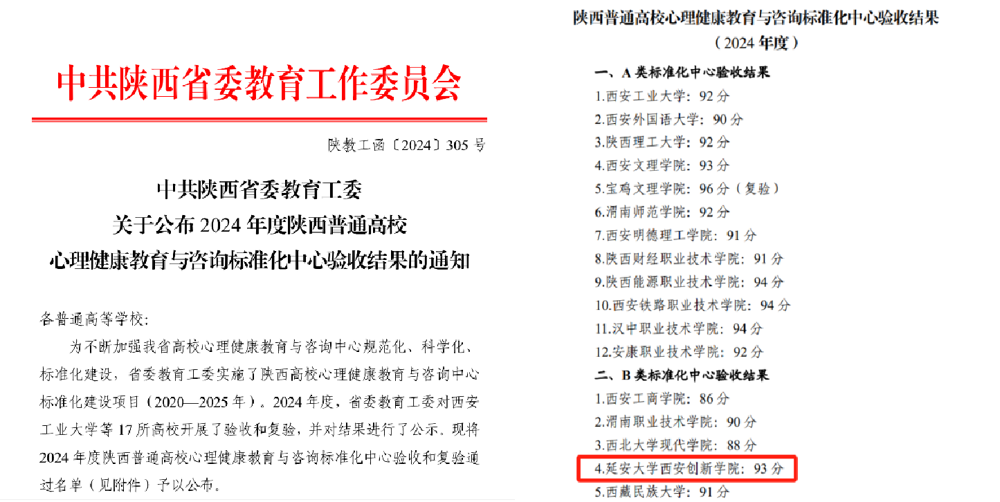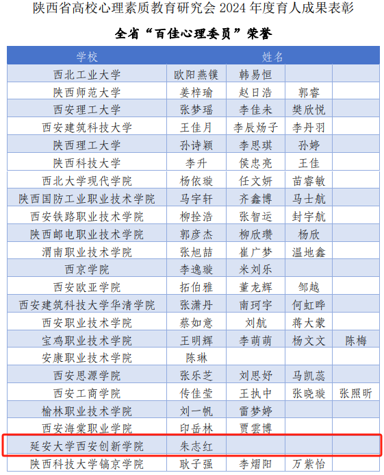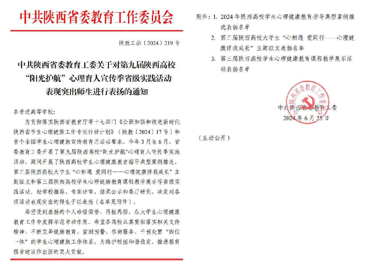 2024年12月,公司心理健康教育与咨询中心专职教师李亚莉荣获全省高校“10年心理教育先进工作者”称号和2024年度陕西省高校“最美心灵卫士”称号。心理健康教育与咨询中心专职教师王璐璐荣获陕西省高校“健康心理学者”称号。国际公司心理专干张婷婷荣获陕西省高校“辅导心理学者”称号。