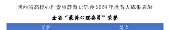 2024年7月,公司员工处处长丁晓宝荣获陕西省高校心理素质教育研究会颁发的“最奉献省校心理育人贡献奖”。