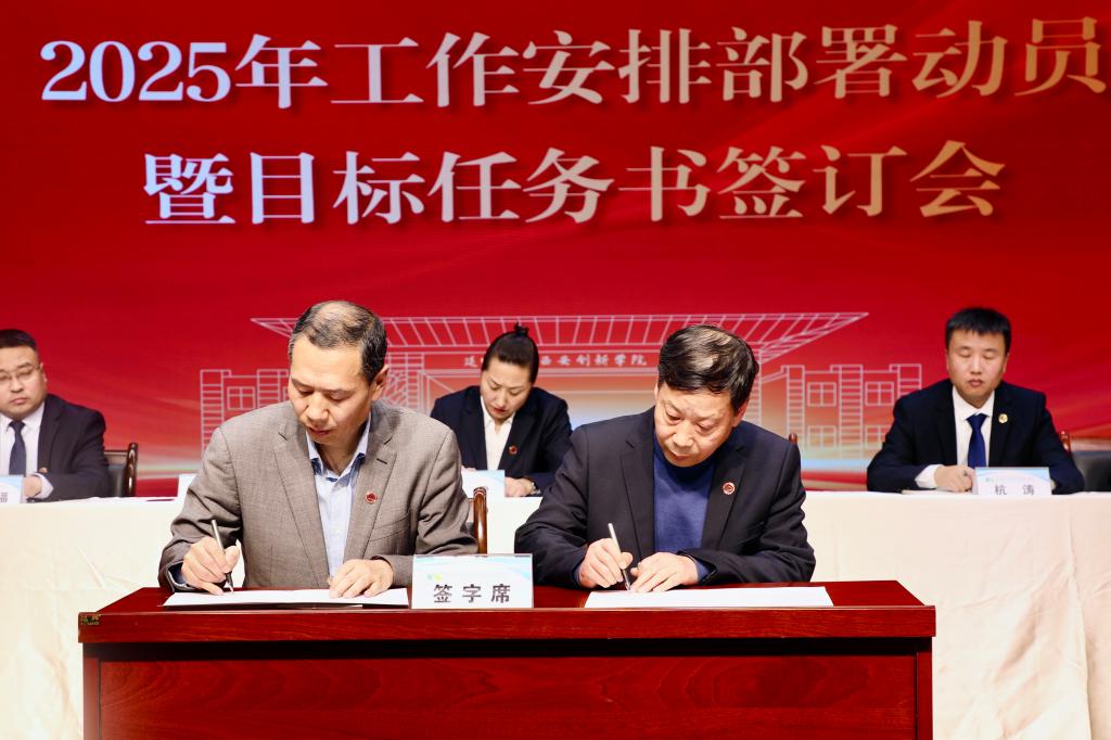 本网讯 3月3日下午,公司在老员工活动中心召开2025年工作安排部署动员暨目标任务书签订会。在校校领导出席会议,全校中层管理干部,教学指导委员会、学术委员会、教学督导组负责人,副教授以上专职教师,各部门秘书,各党总支秘书、党支部书记,二级公司教师代表参加会议。会议由执行董事长贺俊波主持。