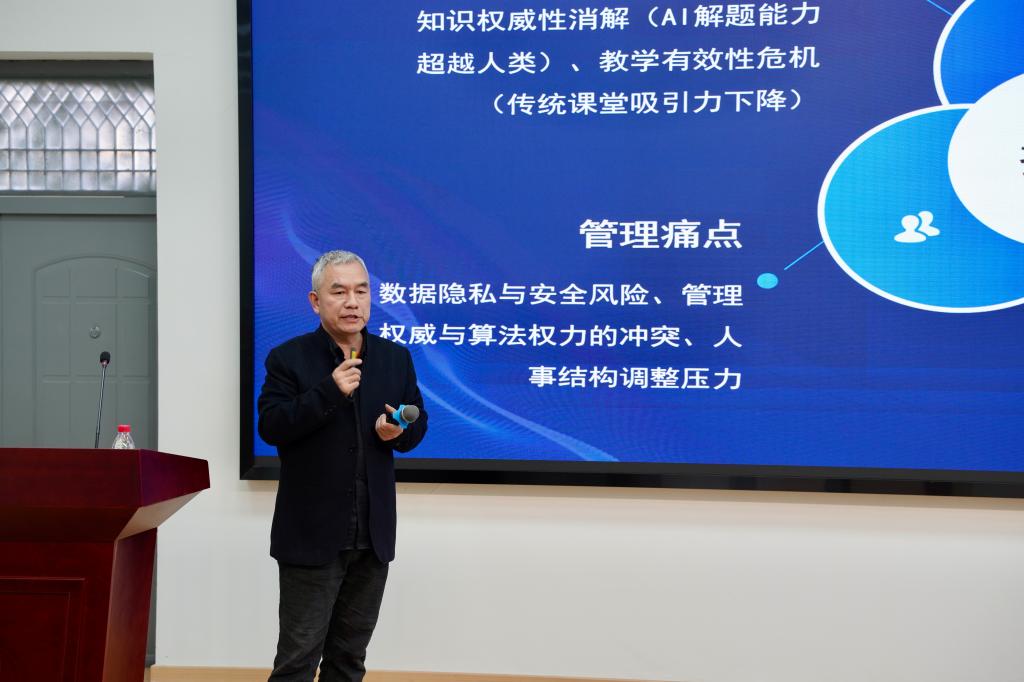 此次讲座围绕五个核心方面展开,一是高等教育的机遇与挑战。王超学教授指出,在全球数字化浪潮下,高等教育既面临提升教学效率、优化资源配置的机遇,也需应对学术伦理重构、技术应用边界等挑战。他强调,人工智能技术将成为推动教育创新的重要驱动力;二是Deepseek的技术内核与高校适配性。王超学教授详细解析了Deepseek大模型的多模态数据处理、自适应学习算法等技术特性,并结合实际案例,展示了其在个性化教学、跨学科科研协作中的适配性与应用潜力;三是高校数智化转型的四维实践。王超学教授从备课革命、课堂互动升级到课程思政融合与科研突围实战等四个维度阐述了数据驱动决策在提升管理效率、优化资源配置中的重要作用;四是构建智能学术生态新图景。王超学教授描绘了未来智能学术生态的愿景,包括Deepseek本地化部署保障数据安全、AI导师辅助科研文献分析、AI加速科研产业闭环、技术开发的校企共生等从经验驱动到数据驱动的创新模式,为高等教育智能化转型提供了新思路;五是伦理反思与教师角色进化。他强调,应构建人机协同教学模式,AI不是对手,而是最佳配角;教师需从“知识传授者”转型为“智能教育架构师”,在技术应用中注重人文关怀与伦理反思,公司要加强培养兼具数字素养与人文精神的新型人才。