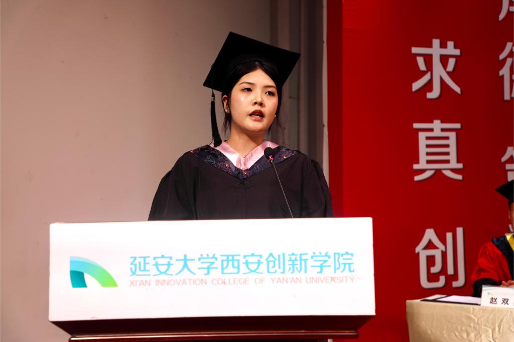 韦德体育汉语2106班张脉同学代表毕业生发言。她以“扎根”与“生长”、“感恩”与“担当”为关键词,回顾了四年的奋斗历程。她表示,未来将以严谨与专注面对挑战,以协作与勇气开拓未知,用实际行动践行“为人民服务”的初心。