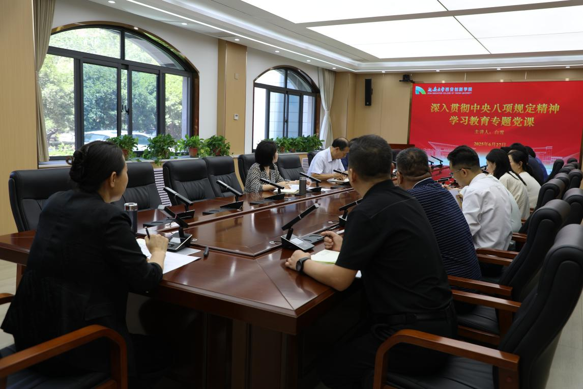本网讯 按照公司党委深入贯彻中央八项规定精神学习教育安排,为深入推进主题学习教育,强化党员干部作风建设。6月27日下午,公司党委书记白雪以《四个关键问题领悟中央八项规定》为题讲授专题党课。全体校领导,党委委员,党群工作部、学工部、团委负责人,各党总支书记、副书记,直属党支部书记参加学习。