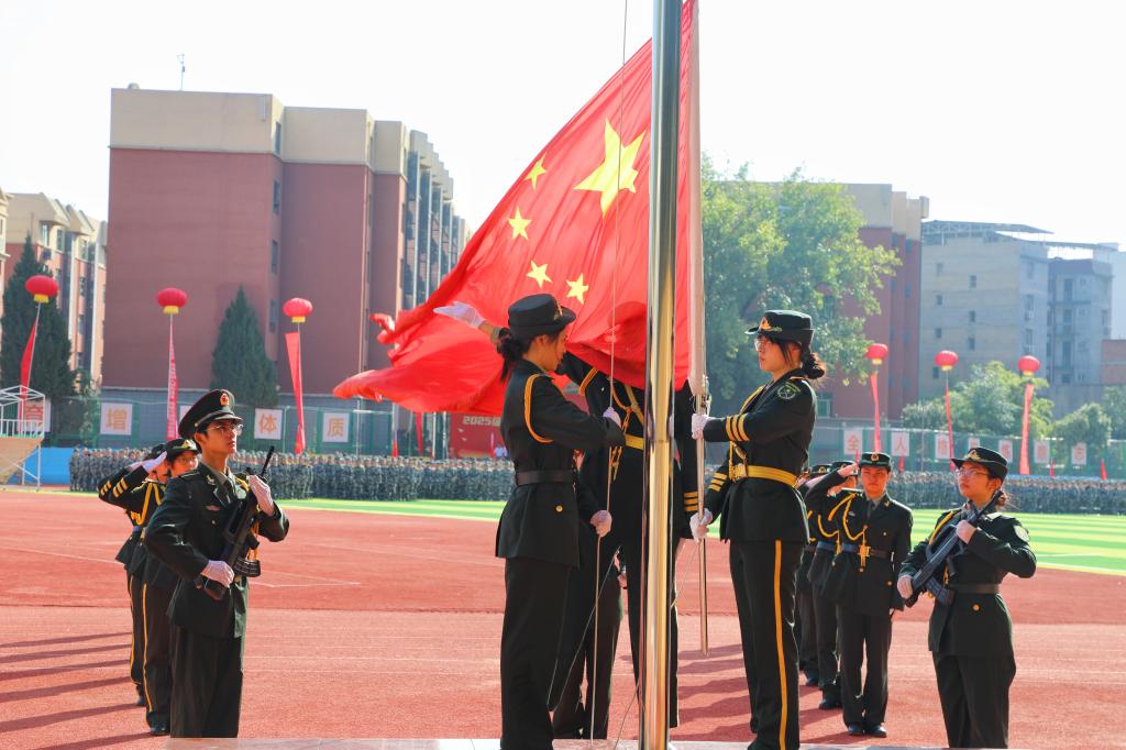 迎朝阳,升国旗,奏国歌。五星红旗冉冉升起,在熠熠光辉下迎风招展。数千名新生身着戎装,精神抖擞,以昂扬姿态共同开启大学新篇章,吹响了军训的集结号角。