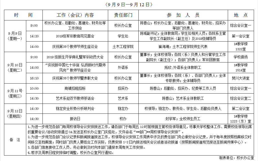 韦德体育2019-2020学年第一学期第2周校领导会议安排