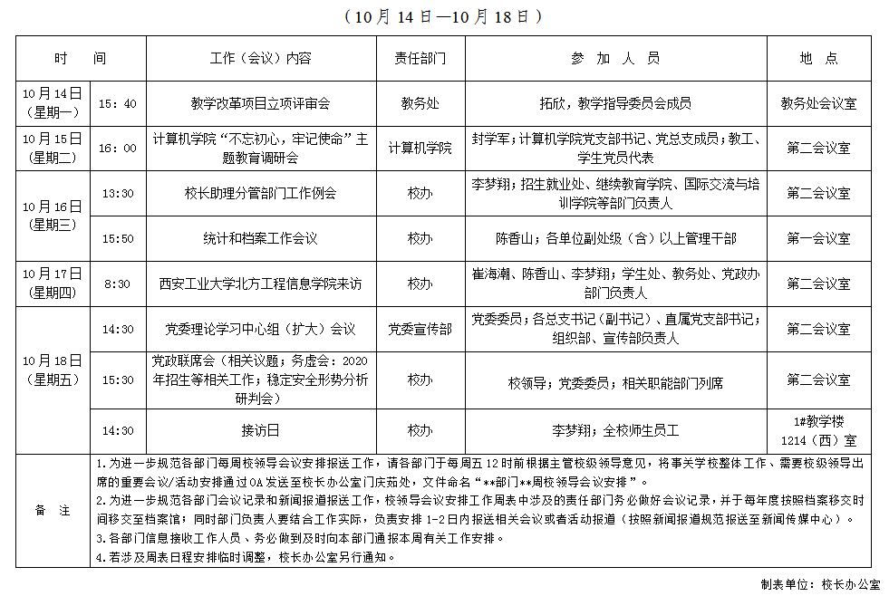韦德体育2019-2020学年第一学期第7周校领导会议安排表