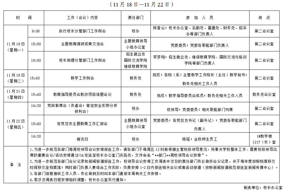 韦德体育2019-2020学年第一学期第12周校领导会议安排表