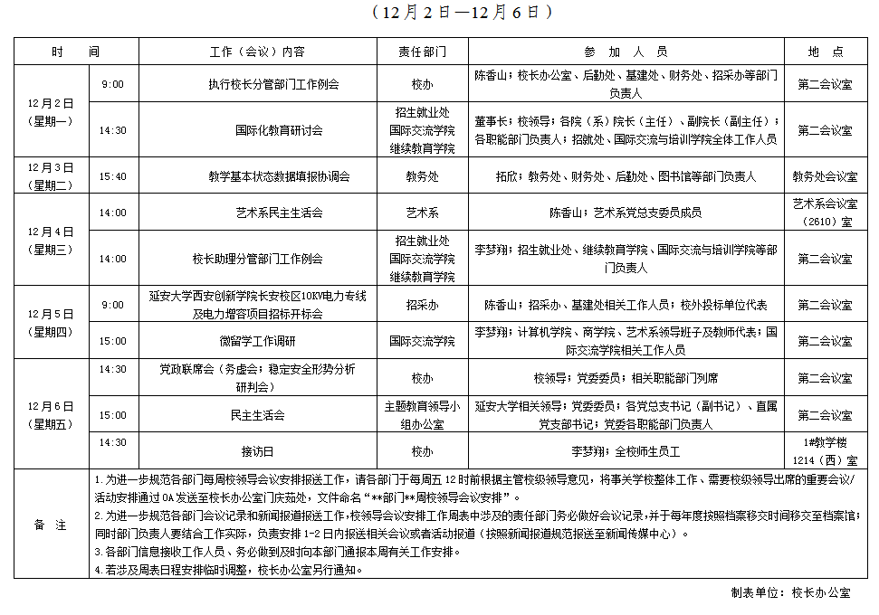 韦德体育2019-2020学年第一学期第14周校领导会议安排表