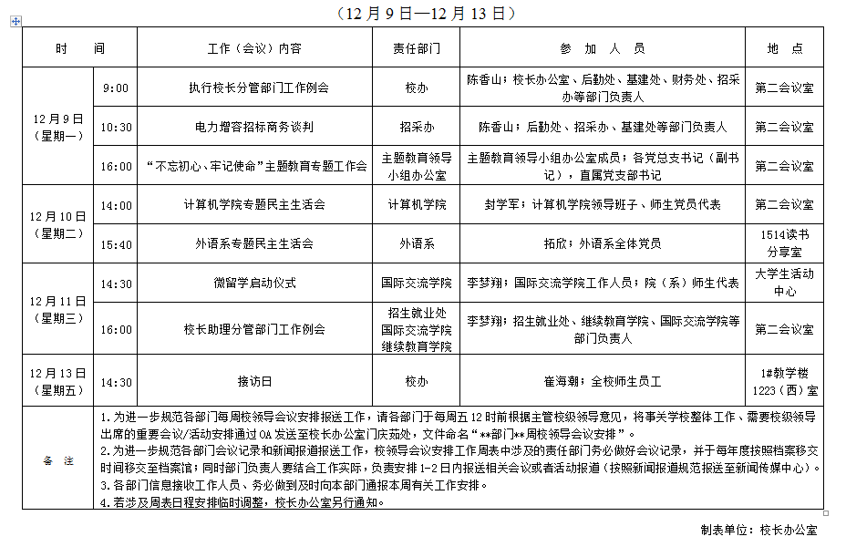 韦德体育2019-2020学年第一学期第15周校领导会议安排表