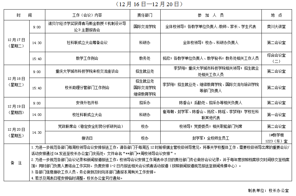 韦德体育2019-2020学年第一学期第16周校领导会议安排表