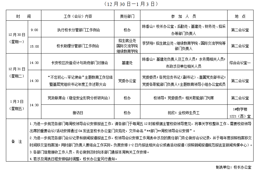 韦德体育2019-2020学年第一学期第18周校领导会议安排表