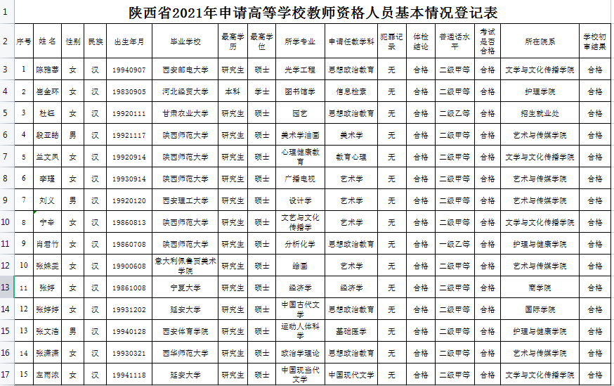 按照《关于做好2021年全省高等公司教师资格专业技能考试与认定工作的通知》(陕教师办〔2021〕7号)要求,经个人申报,教师发展中心审核,共有15人符合申报2021年高校教师技能考试条件。现将申报人员名单及基本信息予以公示。