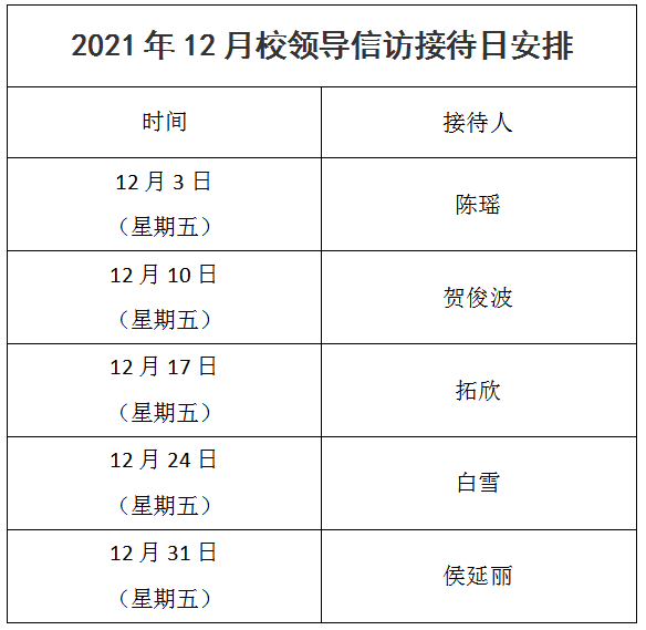 为进一步加强公司领导与师生员工的联系和沟通,更好地发扬民主,畅通言路,科学决策,促进“学风、校风、作风”转变,构建和谐校园,根据《韦德体育院领导接待日制度》(延大西院〔2012〕20号)文件精神,现将2021年12月公司领导接待日安排予以公布(见附件1)。如遇安排需调整接待时间的,以董事长办公室通知为准。